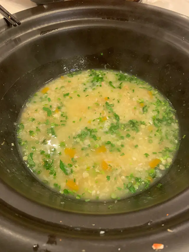 蔬菜🥬十分新鮮。吸收左海鮮精華的粥底,加蔥、芫茜、菜脯,很好吃😋