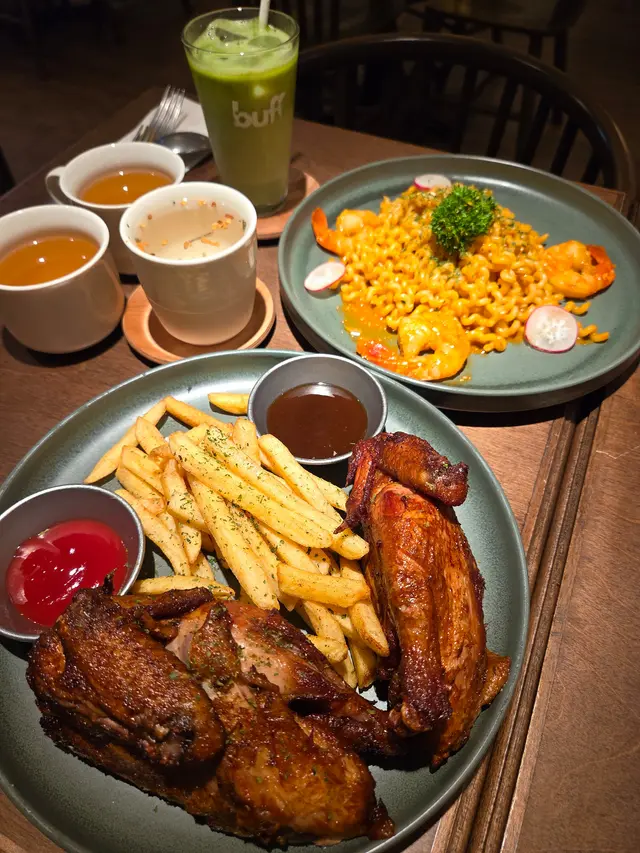有成隻開半既燒春雞🐣,大大隻份量十足🐔,燒得恰到好處🔥,外脆內嫩有雞汁💦,點埋佢個特色醬,甜甜酸酸地夠晒惹味,配埋薯條🍟夠晒飽肚