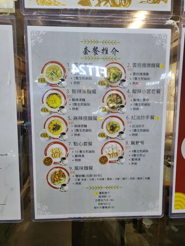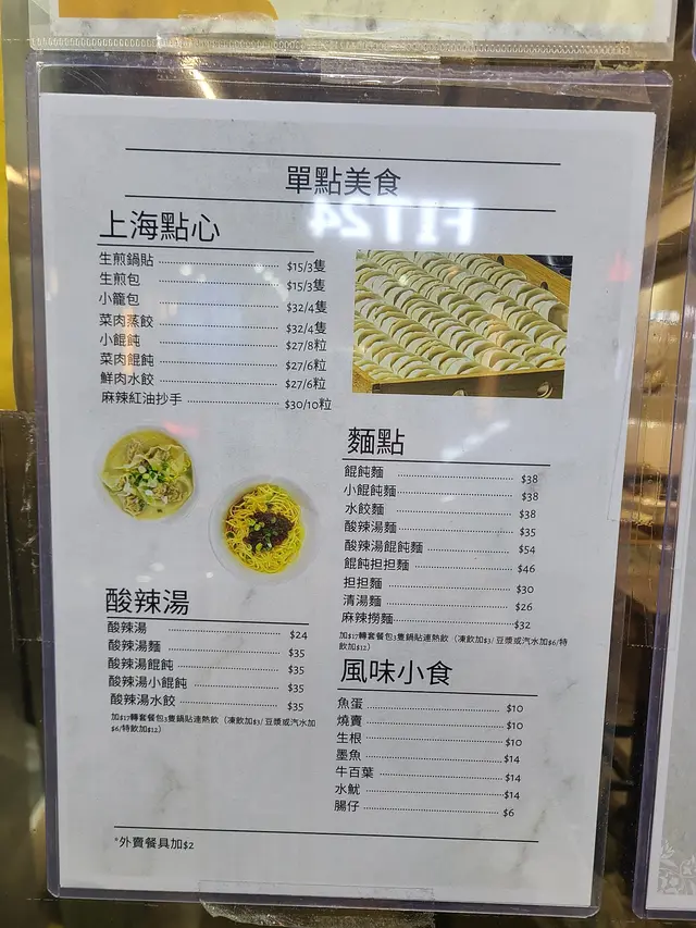 餐牌:上海點心如鍋貼、生煎包、小籠包及葱油餅,酸辣湯,麵點,風味小食。都有套餐。