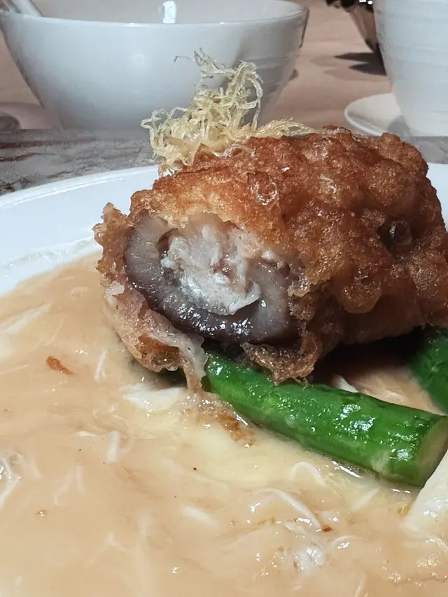 相信「海鮮汁脆皮釀遼參」乃係功夫菜,將遼參炸得金黃恰到好處,令整件遼參有豐富既口感,海鮮汁乃錦上添花~