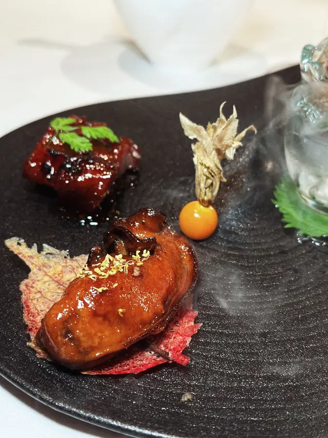 先來既係3款前菜— 「冰煙藤椒蟶子、炭燒西班牙黑豚肉叉燒、桂花蜜汁香煎金蠔」,係一道頗有記憶點嘅前菜,除咗鮑魚有吸睛既煙霧效果之外,味道上亦屬中上!