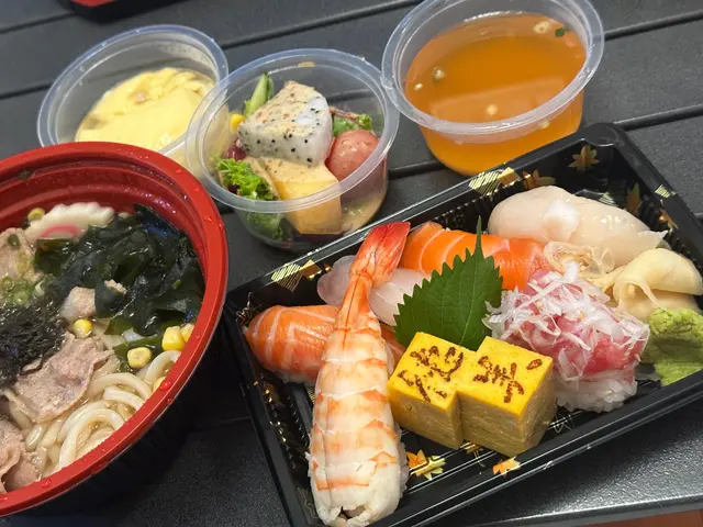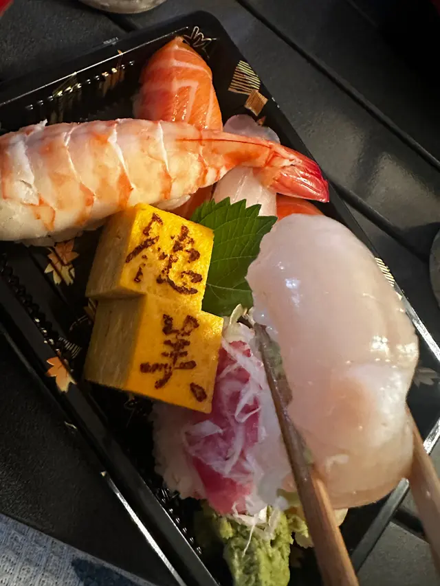 帆立貝、吞拿魚蓉、三文魚、蝦等壽司仲有兩件玉子燒。