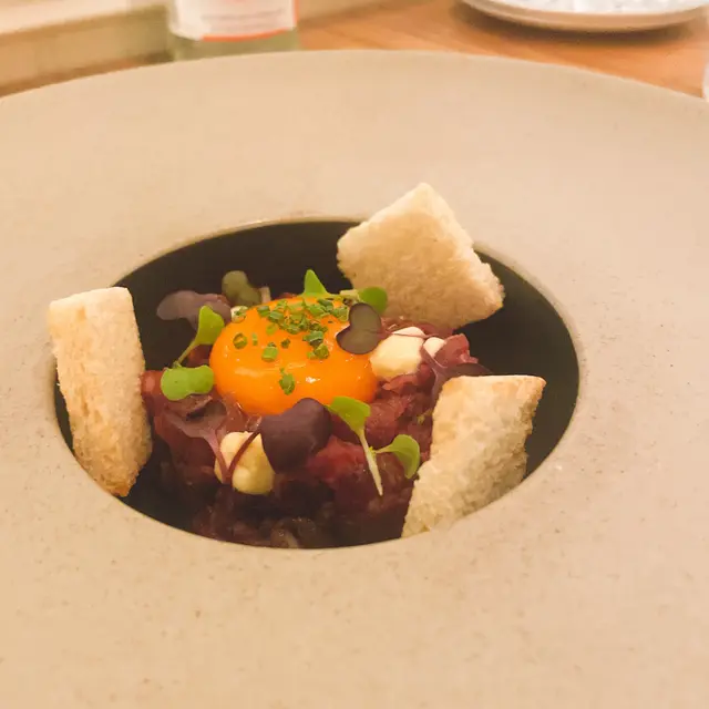 生牛肉混咗酸青瓜同洋蔥粒,質地細滑似雪糕,但草飼牛嘅野味偏重,可能唔係個個接受到。伴碟嘅蒜蓉多士脆到「咔哧」聲,蘸蛋黃食幾過癮~