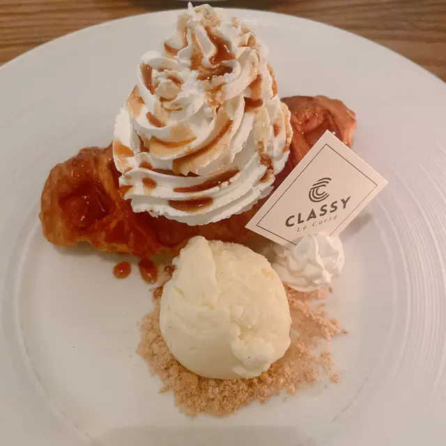 將牛角包壓成窩夫格紋,烘到外層酥脆到掉渣,內裡保留牛油香!配雲呢拿雪糕同焦糖醬,凍熱交融,唯一挑剔係雪糕溶得好快😆