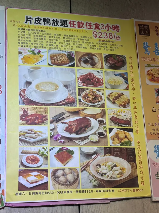 整體嚟講,任食3個鐘好足夠,野食選擇好多,有啲點心、小菜、燒味、炒粉炒麵都未試到,另外出菜好快,侍應都有不時收碟換碟,感覺良好~