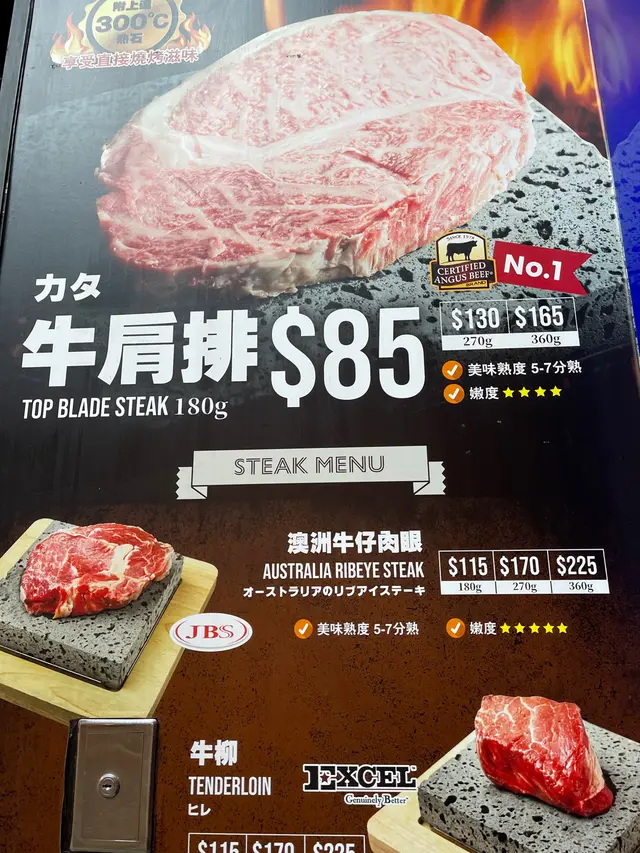牛可以有唔同級數同份量俾你揀,最平最經濟嘅牛肩肉$85/180克,基本叫呢個份量都夠食!