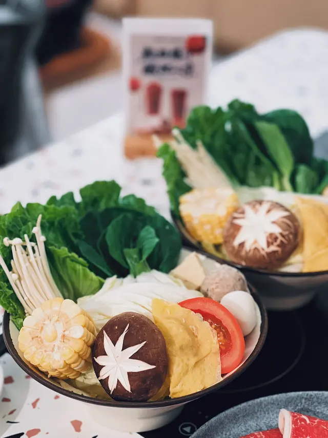 蔬菜拼盤真是一個字:多!有小白菜、小棠菜、生菜、油麥菜、金針菇、花菇、粟米、蛋餃、貢丸、魚蛋同千葉豆腐,樣樣新鮮!🥬 燙熟後爽脆又鮮甜,特別係金針菇同花菇,吸晒湯底精華,超好味!