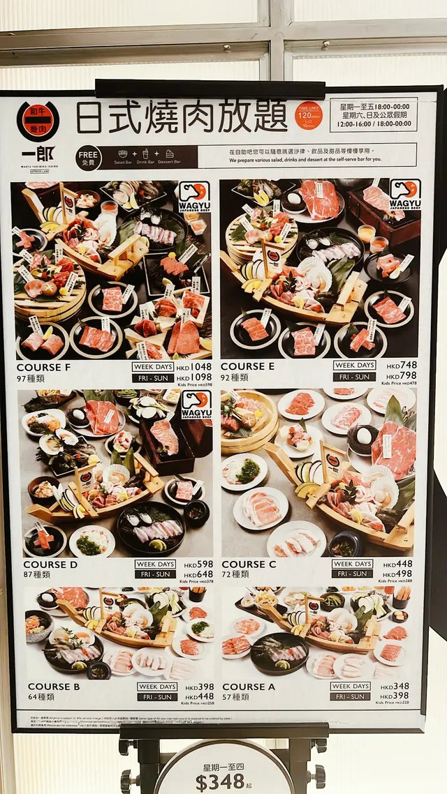 響門口見佢個Menu有分6個唔同價錢既燒肉放題,店員響門口主動介紹個陣提及到,任何放題都會包沙律吧﹑汽水﹑特調飲品及甜品都係任飲,而價錢分別在於放題A-B餐以美國牛為主﹑C餐以澳洲牛為主﹑而D-F餐就會以餐廳主打日本小田牛 - 和牛為主,然後再視乎價錢有更高級同多樣既和牛肉提供。考慮一陣後,小編與老公都決定試下套餐E,雖然價錢偏貴但因為見到有生牛肉料理,所以即管試試抵唔抵食先。