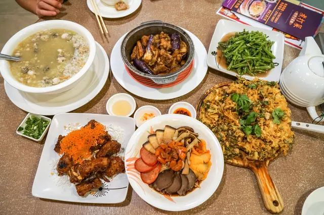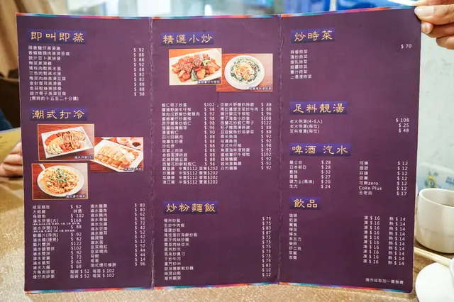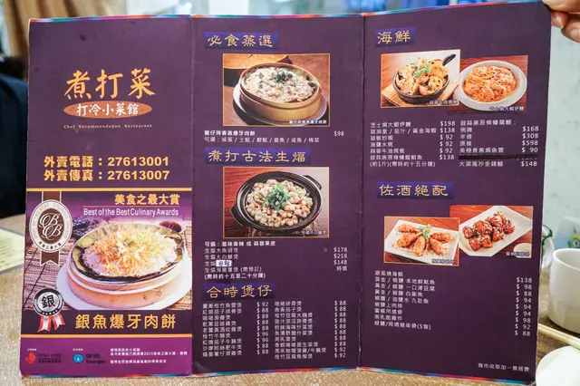佢主MENU係紫色嗰份,而另外黃色MENU就精選D菜式做廚師推介。最後我同朋友決定叫 紅燒茄子排骨煲($88)、蜜椒吊燒骨($98)、滷水拼盤(小) ($88)、蠔仔肉碎粥(每窩$102)、蝦醬通菜($70)、潮式爆花蠔餅($96)
