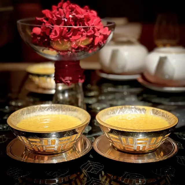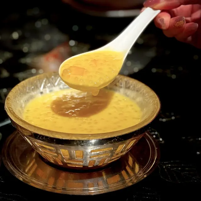 甜品是香甜的楊枝甘露!那金碧輝煌的盛碗令它生色不少,不止賣相美絕連食味亦到位,讓我們得到一個美好的結局。