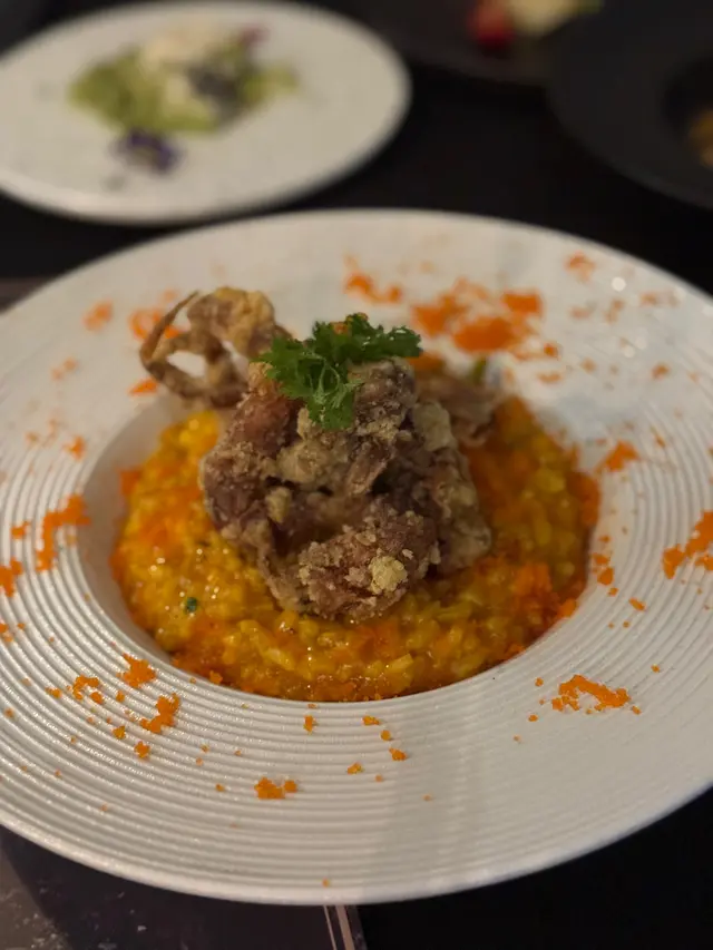 · 炸軟殼蟹蟹黃意大利飯:軟殼蟹炸得香脆不在話下,最驚喜是它的意大利飯!一改傳統膩滯的感覺,廚師加入了大量蔬菜,帶來一種清新的口感,是個非常創新的食法!