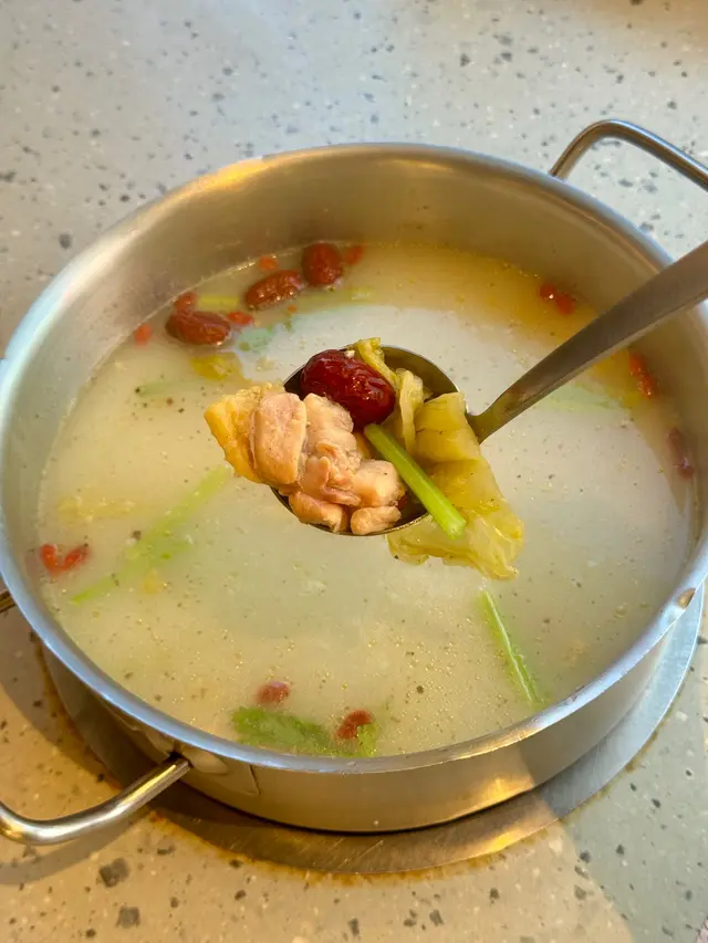 點選咸菜胡椒豬肚雞湯,建議滾起先飲湯再加火鍋食材,暖身咸菜配搭紅棗、唐芹及豬肚雞,胡椒香濃厚夠暖胃