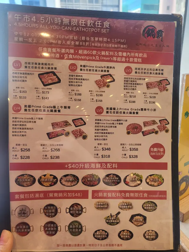 午市放題有5種套餐,我哋揀咗Lv2套餐,主要分別在於肉類,而其他火鍋配料都可以任點任食,另加40蚊升級海鮮。