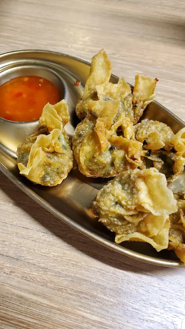 細細粒的韭菜餃皮薄餡足,炸至金黃酥脆,蘸泰式甜辣醬更添風味。