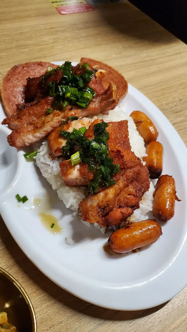 呢個飯樣樣餸都好食,真係無得輸。有煎到好香口的午餐肉、外脆內嫩的芝士腸,以及肉質厚實的蔥油豬扒和雞扒,搭配蔥油拌飯,正!