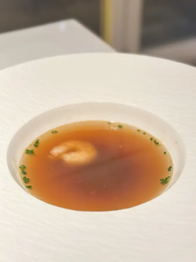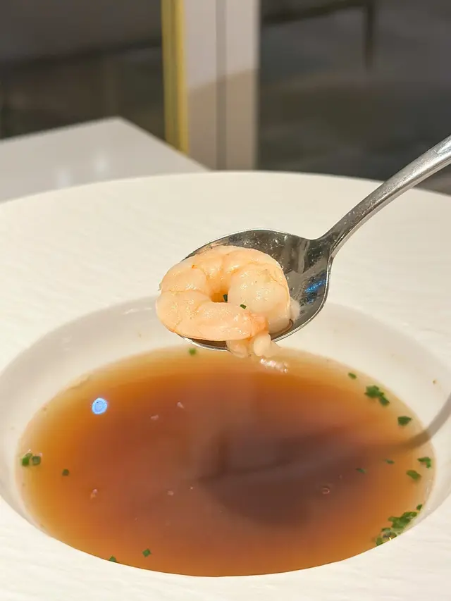 法式海鮮清湯,加入紅蝦殼熬煮12個鐘而成,帶濃濃蝦鮮味!