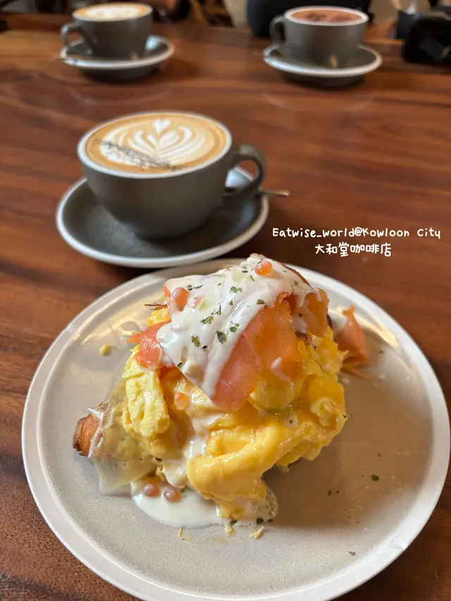 - 煙三文魚炒滑蛋酸麵包配三文魚籽 (轉牛角包):$98
