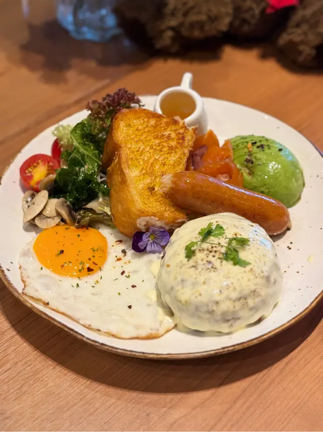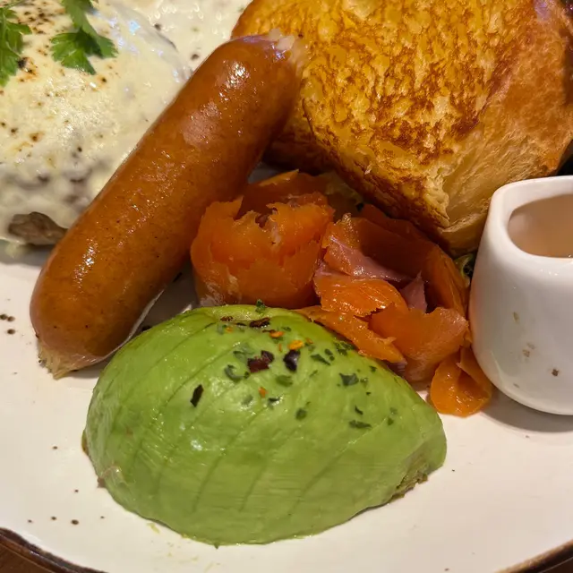 呢盤全日早餐好豐富,有漢堡扒、煙三文魚、牛油果、炒雜菇、煎蛋…