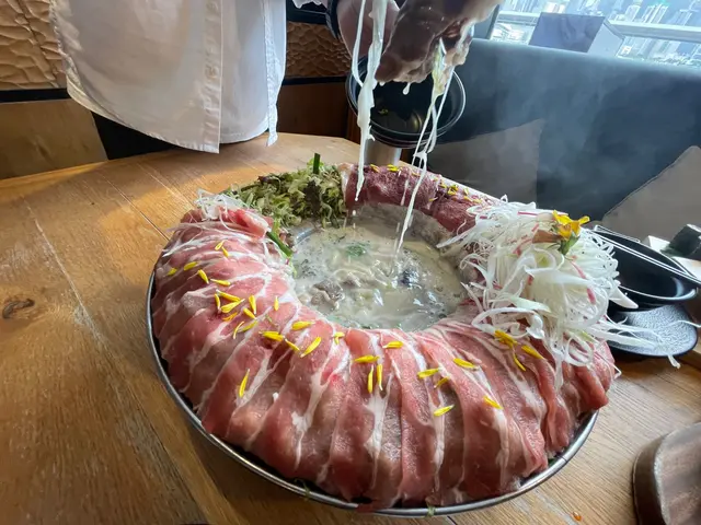 啲鍋底一上到媽咪真係嘩咗出聲,和牛同豚肉嘅雪花紋一見就知好靚,好正。湯底係雞白湯 ,湯底有啲甜味,而且味道好濃郁,應該係熬咗好耐嘅湯底