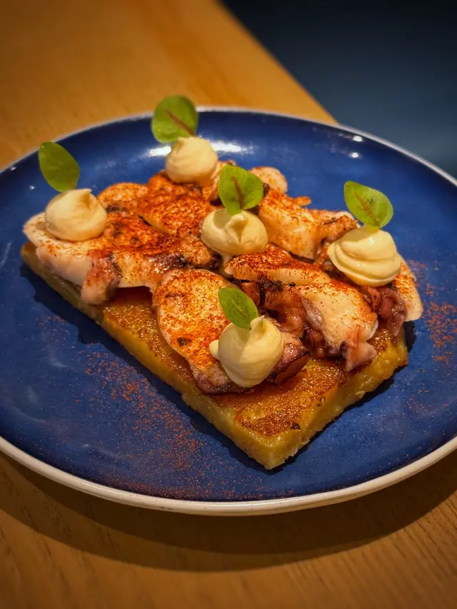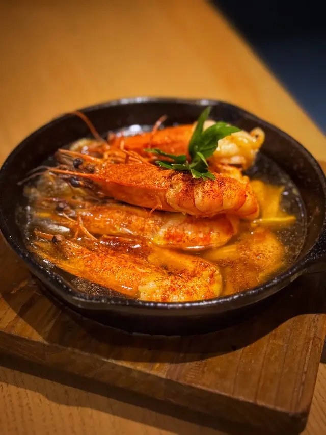主菜部分,伊比利亞豬肉表現相當不錯。肉質嫩滑多汁,搭配的炸手切朝鮮薊處理得宜,獨特的清香與爽脆口感,與romesco醬搭配得恰到好處。海鮮方面,加利西亞風格章魚肉質軟嫩,風味地道。大蒜辣椒大蝦的蝦肉新鮮彈牙,不過蒜香與辣椒風味若能更鮮明些,會更加完美。
