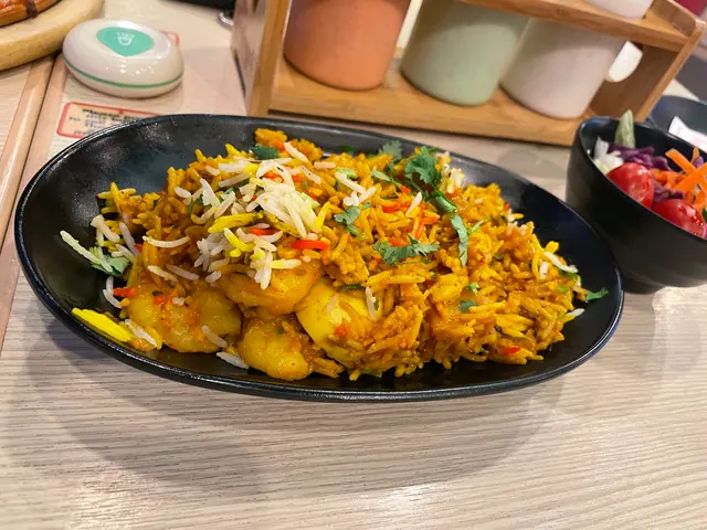 炒飯配有沙拉,全部係長粒米,應該撈左姜黃粉同咖喱粉一起炒,味道好濃郁,再配上清爽沙拉,一點也不油膩。