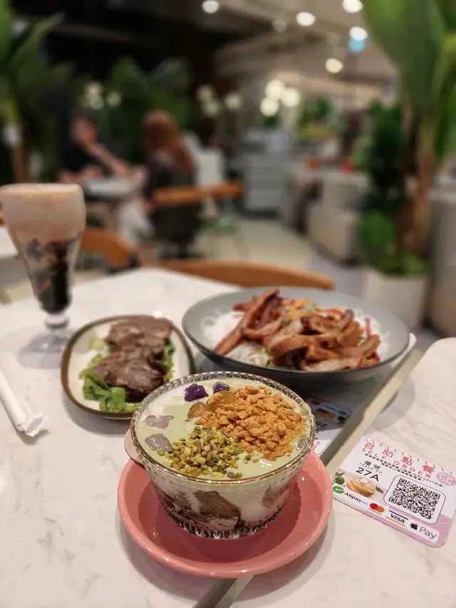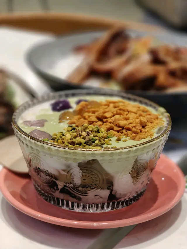 一勺挖出滿滿幸福感!💚 綿密的開心果醬配上雪糕、Q彈的紫色芋圓🍡和滑溜的晶瑩涼粉🖤,冷熱交織的口感超驚喜!💫 撒上大把開心果碎增添脆脆層次。雪糕+果碎+芋圓+涼粉的多重奏🎵——綿密、香脆、軟糯一次滿足,甜度剛剛好完全不膩!💚