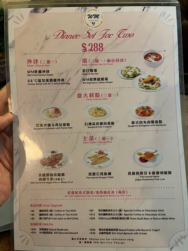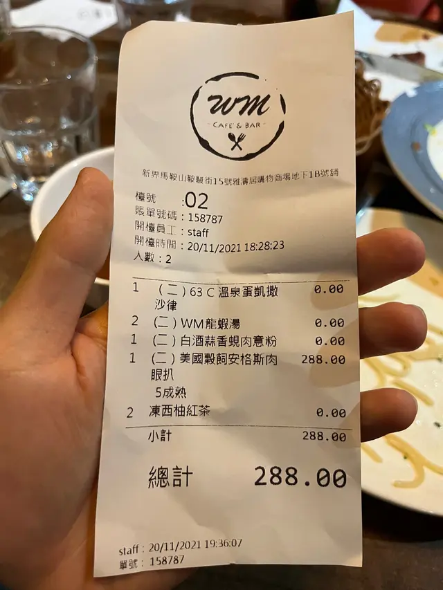Dinner Set 有安格斯靚扒抵食! Cwlpatrick等级42021-11-2385 浏览 关注 安格斯肉眼扒原本以為$288嘅二人套餐唔會食到太正嘅牛扒,但係上碟嘅時候,已經見到牛扒有網紋一樣嘅靚仔樣。切開嘅時候,裏面有真係有medium level 入口可以聞到有少少炭燒味道。牛扒係高質素嘅!另外,雖然我要承認,薯蓉的樣子不是太討好,但係其實就真係真材實料。一般餐廳嘅薯蓉都係開粉整,但呢度嘅薯蓉入口嘅感覺,同我喺屋企自己拎薯仔整嘅係一樣!安格斯牛扒白酒煮蜆意粉🍝雖然白酒會喺主嘅過程之中蒸發左,但都仲有少少餘香可以嗅到。意粉都算係彈牙嘅,蜆肉嘅份量就少啲,我都係配埋牛扒一齊食,感覺就會冇咁齋龍蝦🦞湯!好飲,龍蝦味足夠龍蝦湯溫泉蛋沙律🥗算係簡單但係有正常質素,溫泉如果流心嘅話就更加好西柚紅茶其實入口感覺同檸檬茶冇乜大分別~ 但正常地好飲 😬以上食记乃用户个人意见 , 并不代表OpenRice之观点。赞好分享Dinner Set 有安格斯靚扒抵食! WM Café & Bar (雅濤居購物商場) https://s.openrice.com/QrLT0BxX000检举 张贴 评分5味道4环境5服务4卫生5抵食推介美食安格斯牛扒龍蝦湯用餐日期2021-11-20等候时间10 分钟 (堂食)人均消费$144 (晚餐)