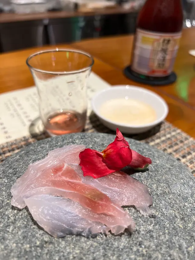 英鯛刺身,肉質輕柔,晶凝通透,沾3秒古風醬汁,帶出魚味。竟然配置古代米酒「依根滿開」,少有嘅紅體酒,以梅子浸製,酸度較高。