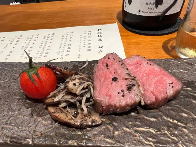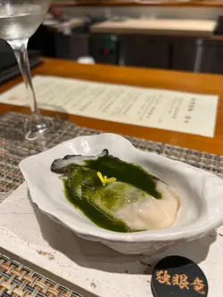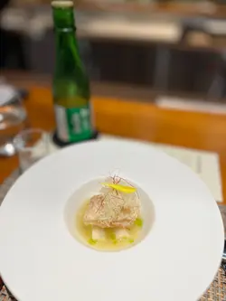 日本直送生蠔,口感爽脆,入口滑溜至極,以番茜製作醬汁,酸甜而帶出蠔的鮮味。配以大吟釀,米香清新。