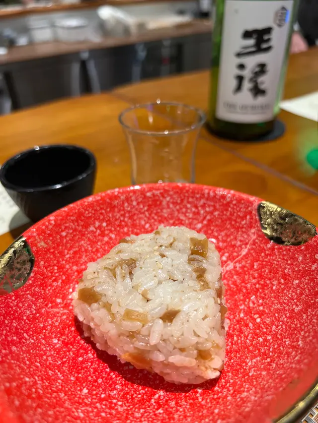 暖酒要以黑鐵杯盛載,令酒感更加滑,相當奇妙的物理作用!配穴子飯團一絕。加入爽甜菜譜和穴子,米飯香甜。