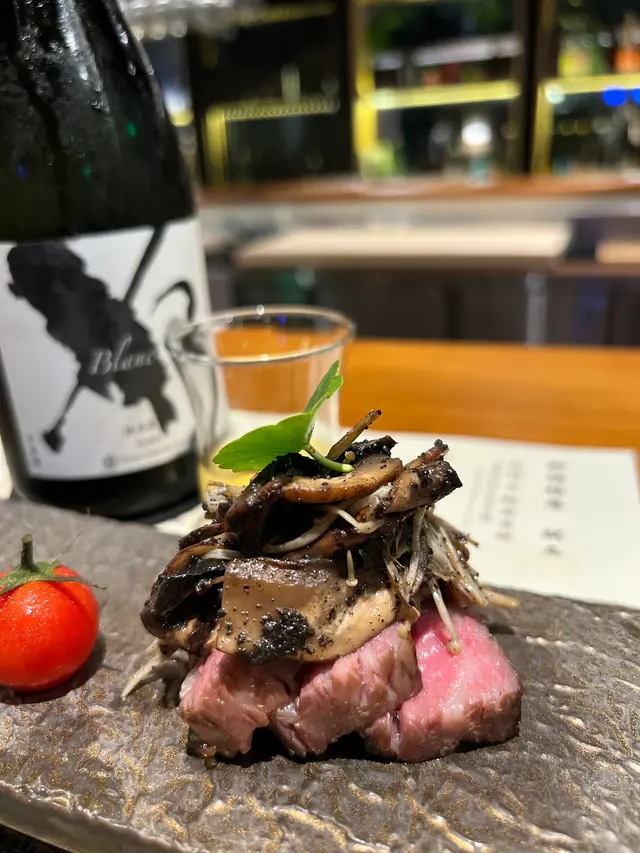 炒到好香嘅黑松露雜菇夠惹味,牛肋肉柔軟,有油脂香配竹炭鹽簡單又美味。配置嘅係Blanc 有3倍麴,米感厚身清香撲鼻。