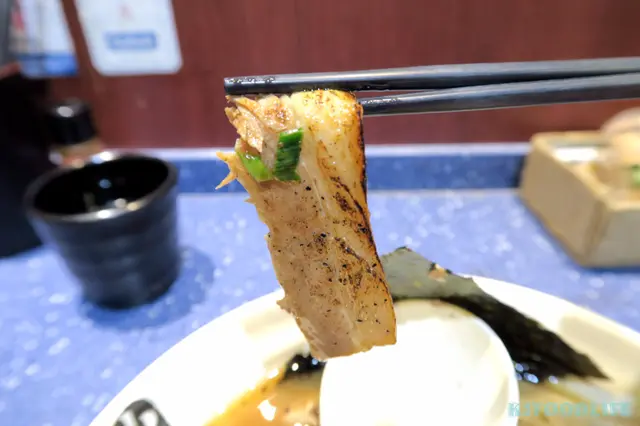 《拉麵DX》($80)配上中叉燒,全部叉燒都係火燒油脂充足,有三四塊都係做到超薄身,麵用上左曲麵,較易掛湯。
