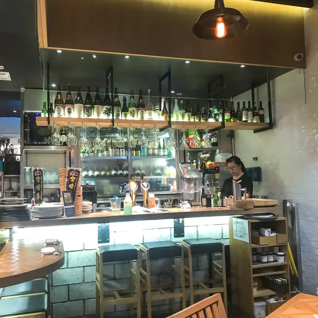 餐廳裡面既裝潢簡約充滿日式風格。中央位置為開放式串燒廚房,配黑白磚牆,風格新潮。餐廳位置唔多,一邊係吧枱,另一邊係高枱高櫈。高枱高櫈其實係一個飲酒傾計既坐法呢。挺chill的!