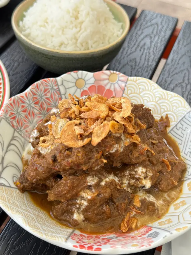 午市套餐的仁當牛肉燉得軟嫩入味,椰漿與薑黃、香茅等香料慢熬出濃郁醬汁,辛辣中帶椰香,搭配鬆軟的馬來西亞椰漿飯,再佐以脆口江魚仔與花生,風味層次豐富。