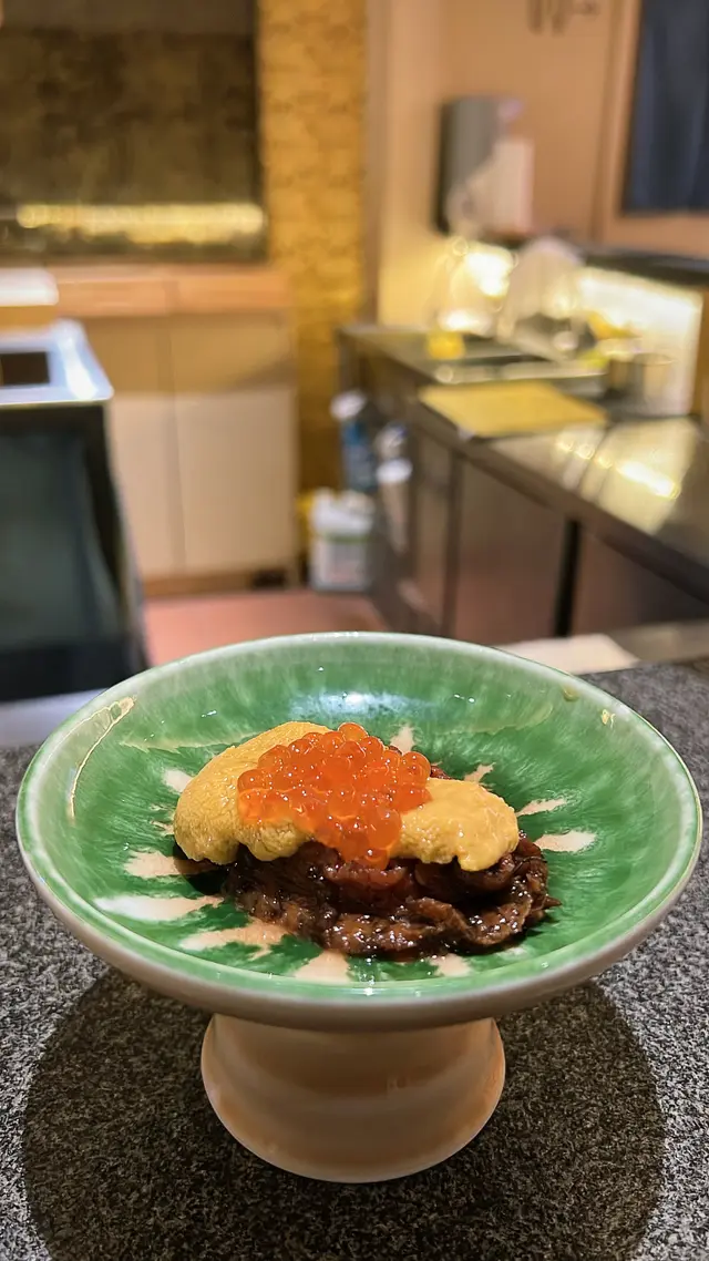 呢個海膽杯餐牌上有個手指公,佢唔係平時有飯係底果種海膽杯,原隻鮑魚上面加上海膽同三文魚籽,賣相精緻,海膽一d腥味都冇,鮮味十足🍣