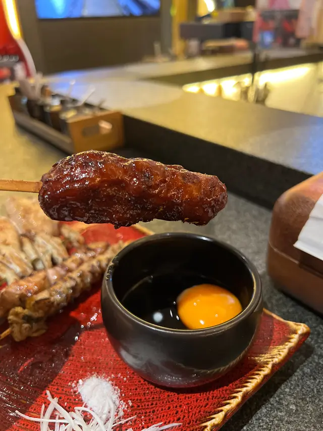 免治雞肉串表面有層簿簿既醬汁,再加埋個月見汁食,滑滑既蛋漿包住啖啖肉🐥