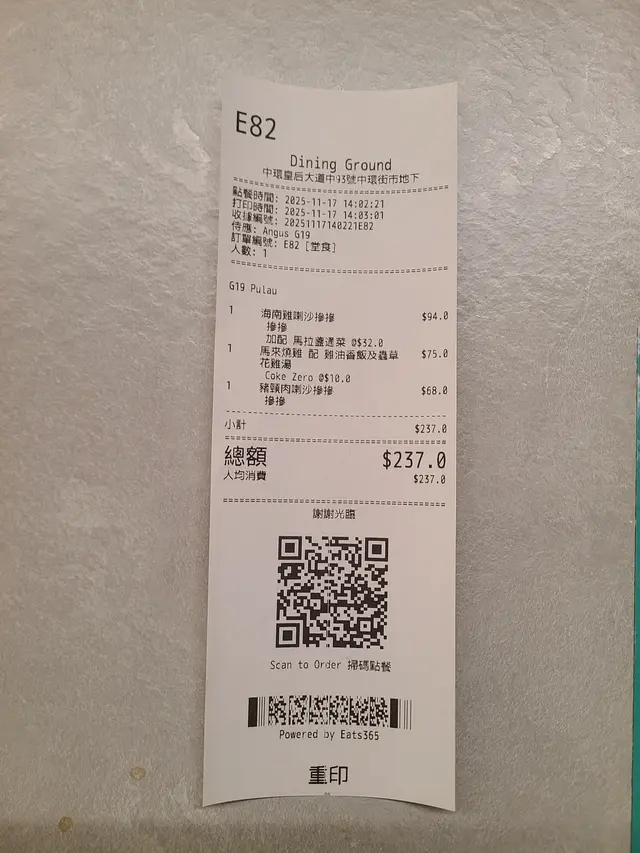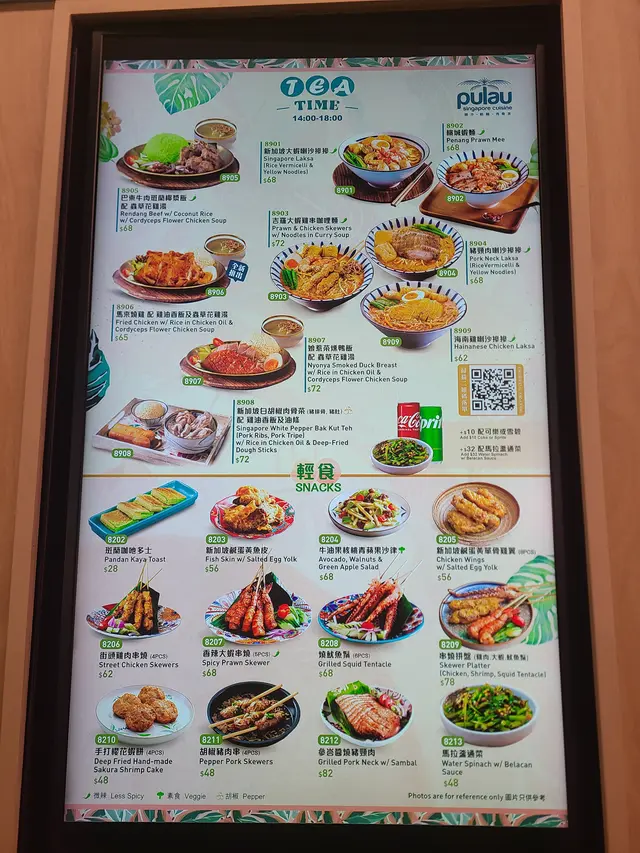 餐牌:兩點有茶餐。茶餐有9款飯粉麵作為主食,另外仲有多款輕食。價錢基本上係$80樓下。可以加錢要通菜或者汽水。去收銀落完單自己搵位坐。