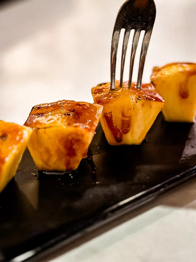 炙燒過的鳳梨片裹著脆糖衣,焦苦與果酸在口中拉鋸,熱帶風情瞬間爆發。