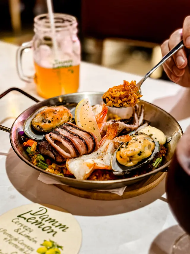 作為招牌菜式的經典海鮮西班牙飯,藏紅花染出的日落色米飯粒粒分明,蛤蜊、青口與大蝦如珠寶般鑲嵌其中。最驚豔是那層「Socarrat」飯焦,薄如蟬翼卻香氣暴擊,完美演繹西班牙飯的鍋巴。