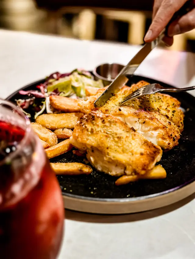 鱈魚柳以精準火候煎出蕾絲邊般的金黃脆皮,刀尖輕觸便露出雪瓣狀的嫩白魚肉。魚脂的豐腴,搭配一杯酒更無懈可擊。