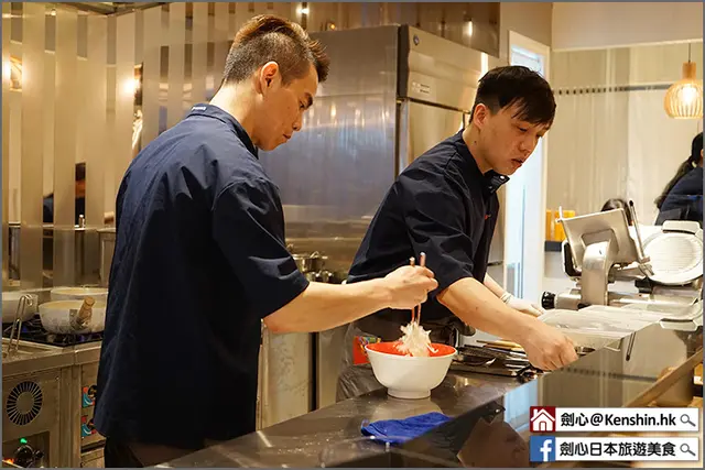 左邊是製作「丼」的地方,灸燒骰子丼的豬肉就在這裡以火槍烤製,當中散發的燒烤香味令人進一步垂涎三尺。其後方就是製麵機的所在。