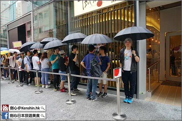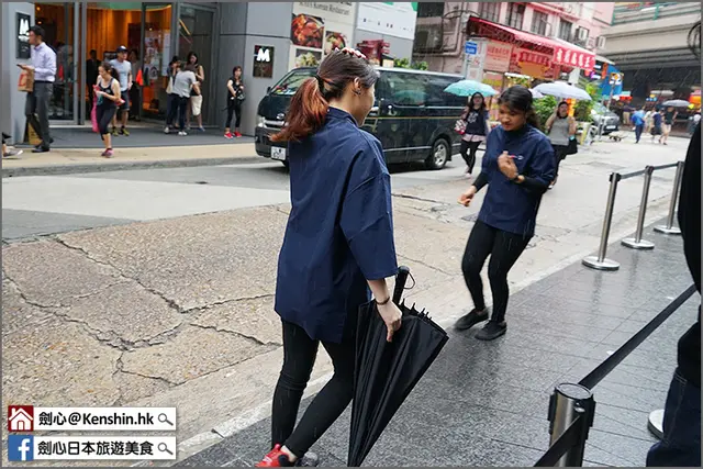 轉眼竟然下大雨,上天可能想給我一點考驗,不過店員立即動作,從店內拿出大量黑色雨傘派給排隊的人,那時已經有近30人排隊,結果全部都有雨傘可用,這服務讓我加分。店內那些受邀請免費試吃的客人出門時,店員也為他們撐傘到馬路對面,不過相信這是那些VIP的獨有服務。