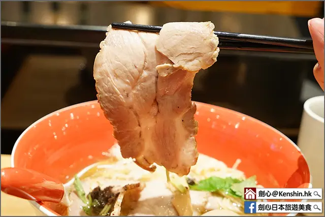 叉燒方面,使用較瘦的豬肩肉,醃製和燒烤方面不是太重手,口感以瘦叉燒來說是上乘,整體來說叉燒就是為了配合本身不算很濃的湯底而成為不搶味的配角。上文提到叉燒顏色和東京本店比較淺,味道也是一樣,日本那邊叉燒帶鹹香到有點似鴨胸肉,香港則是傳統日式叉燒的味道和口感。