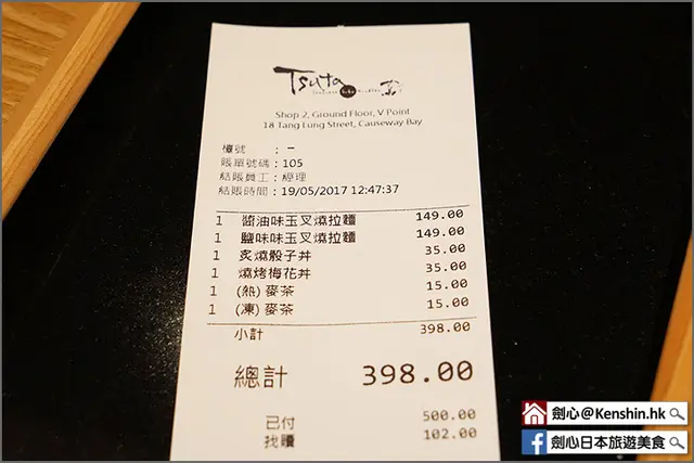 最後給大家看看香港「蔦」的第一張帳單(笑),兩個人吃拉麵吃了四百元,還真的不簡單,而且吃完飯和麵都只是七分飽,追求飽肚的朋友,這裡不是你應該來的地方。