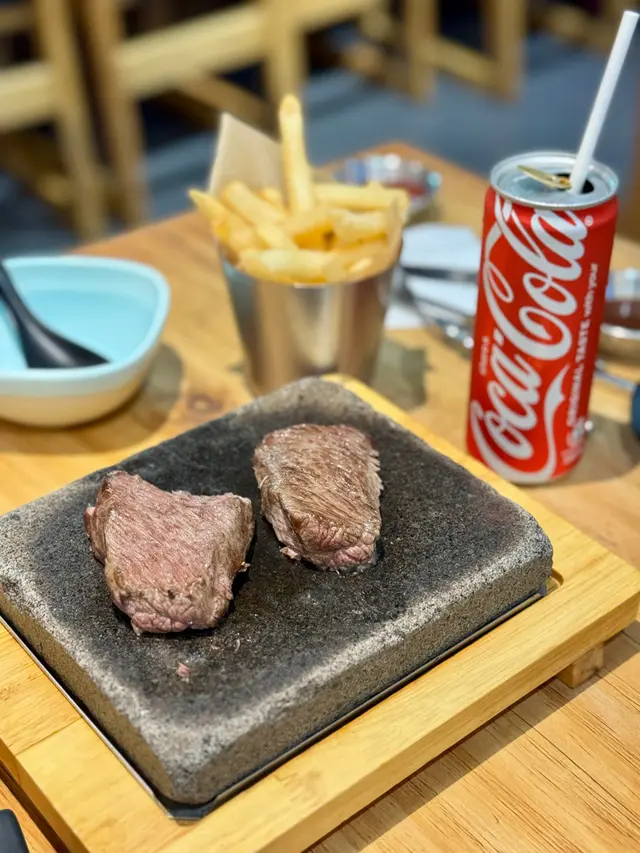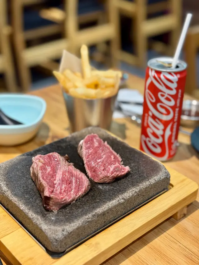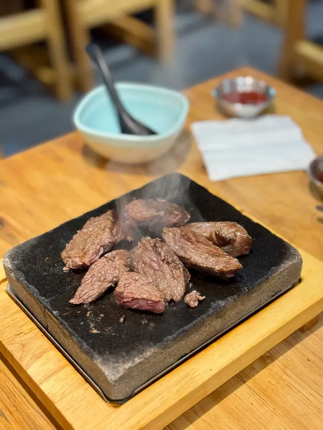 上檯約兩成熟,牛肉鮮紅,切開放在高溫的熱石慢慢燒到適合自己的熟度。