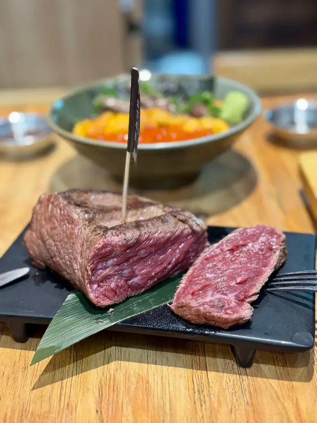 USDA Prime 認証濕式熟成牛排。炸九肚魚。燒肉海膽丼