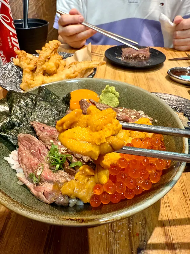 剛剛熟的牛肉,透著粉紅色的,肉味滿滿。海膽新鮮,加上三文魚籽,矜貴度即時提升,味道一流。