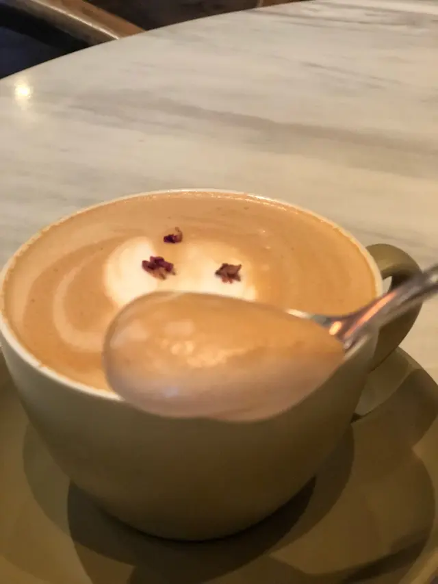 咖啡香气撲鼻,味道驯和,沒太過複雜的苦和酸,奶泡細滑而豐厚,襯托出高雅的玖瑰花芳香。