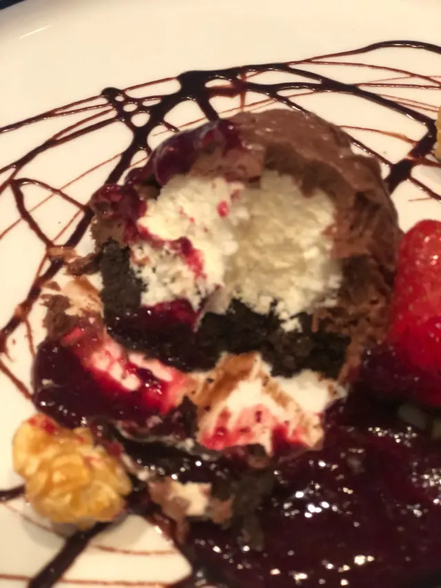 以極濃郁味道醬朱古力蓋著一座雪山,雪山是軟滑忌廉,再配上朱古力餅底,雖然甜度相當高,但只要狠狠地沾一大片旁邊的紅莓醬,味道頓時