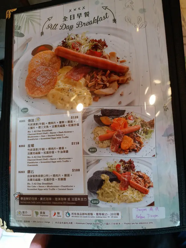 唔係好豐盛嘅咩?好彩我影低menu,對一對都問個侍應,我叫咗邊個All Day Breakfast?佢攞張單睇,都確定我係叫呢個.咁我就問竹炭漢堡呢?佢答冇竹炭漢堡了,可能落單時冇講.咁我問煙三文魚呢?佢至晃恍然大悟知道少咗好多嘢,就拎返去廚房,好快就拎返嚟,加返煙三文魚,都交帶一聲,薯餅炸o緊,一陣再補.